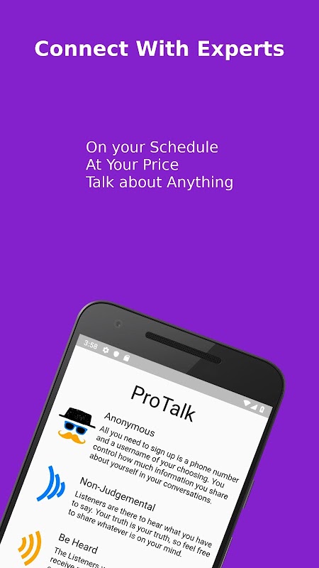 ProTalk experts staan klaar met u over alles wat je geïnteresseerd bent om te praten. Druk gewoon op de knop Spreken om een ProTalk Listener selecteren en u zult worden aangesloten! U kunt ook pingen een luisteraar als ze offline.