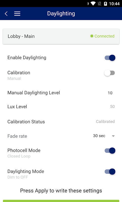 Configureren daglicht oogsten niveaus, aanwezigheidssensor bereik en de gevoeligheid, leegstand time-outs, gedeeltelijke on / off levels, en de reactie van de vraag actie allemaal met uw Bluetooth mobiele apparaat.