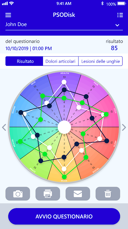 PSODisk è uno strumento visivo e intuitivo, dedicato alle persone affette da psoriasi. Si compone di 10 domande, che esplorano lo stato di salute generale, la presenza di dolore, prurito, la qualità del sonno, della serenità mentale, della vita sociale, la soddisfazione sul lavoro, la vita sessuale, il senso di vergogna e il coinvolgimento cutaneo.
