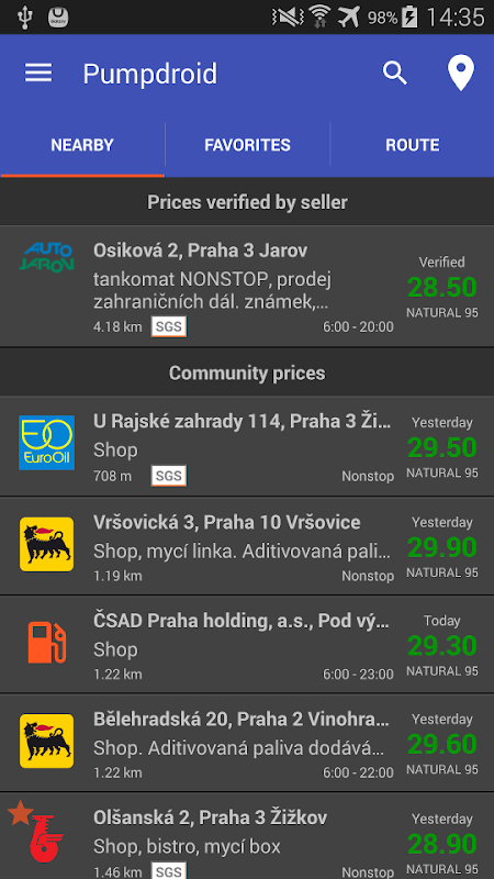 Pumpdroid helpt u bij het vinden van de dichtstbijzijnde pompen met prijzen in Tsjechië.