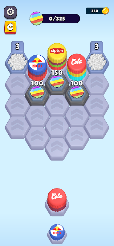 Samenvoegen en wissen: stapel een specifiek aantal bijpassende doppen om ze leeg te maken en punten te verdienen!