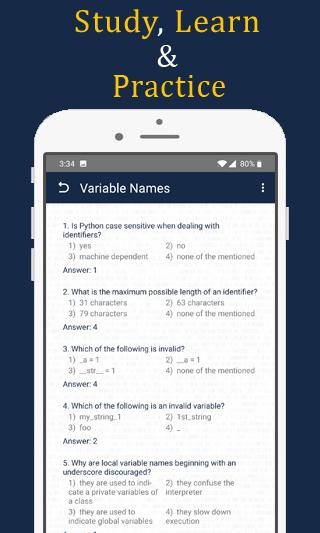 This python programming quiz contains python questions with answers (Topics wise) and as well as QUIZ. Student can read questions with answers and check their knowledge through python programming quiz app.