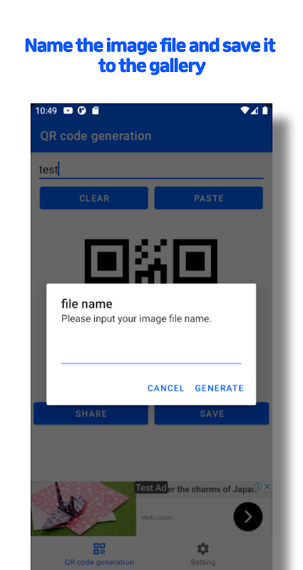 It is an app that allows you to create, save, or share QR codes with input text