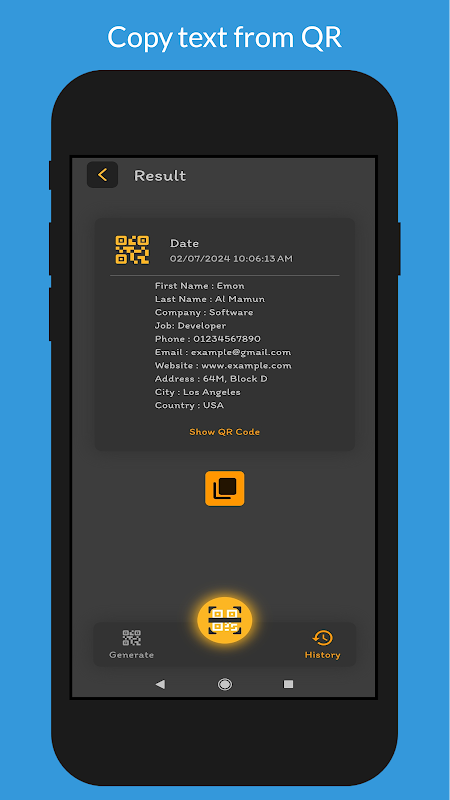 - Geschiedenisfunctie om eerder gescande en gegenereerde QR-codes bij te houden voor gemakkelijke toegang.