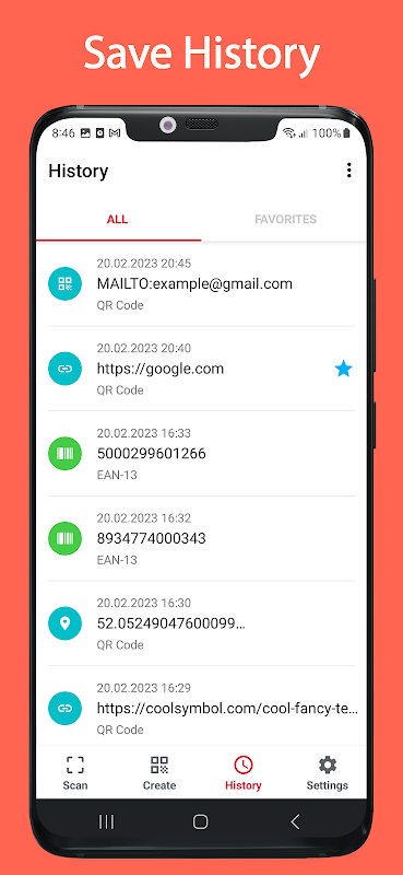 - Deze tool houdt automatisch de code bij die gebruikers hebben gescand en gebruikers kunnen ze later openen op een apart tabblad Geschiedenis in de app.