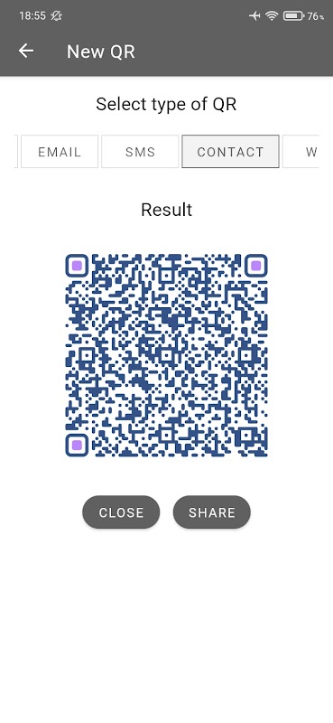 De applicatie kan een QR-code genereren. Het is eenvoudig om uw eigen QR te maken met kant-en-klare oplossingen: tekst, URL, contact, telefoontje, sms, wifi, WhatsApp-bericht, enz. Het eindresultaat kan zonder beperkingen worden gedeeld.