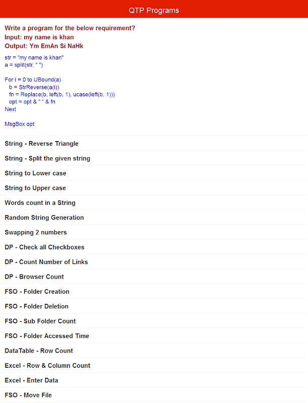 Brengt u de collectie van QTP & VBScript programma's verpakt in de app, die zeer nuttig voor iedereen die wil voor te bereiden op het gesprek en QTP Programming leren. En u kunt bereiden op de weg.