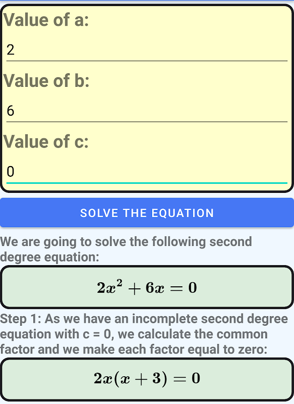 De gebruiker kan elke tweedegraadsvergelijking oplossen. Hiervoor moet je de waarde van de coëfficiënten a, b en c invoeren. Als de vergelijking in standaardvorm is,