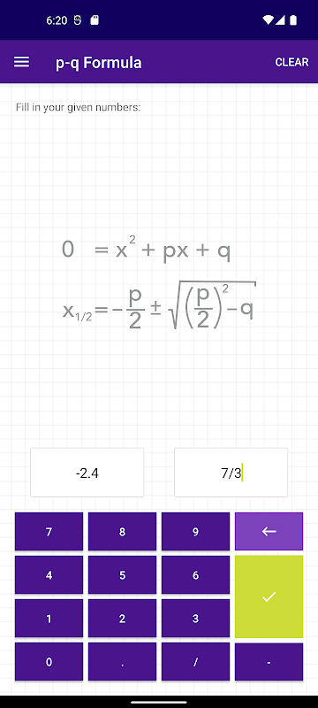 Deze app gebruikt de PQ-formule om kwadratische vergelijkingen nauwkeurig op te lossen. De PQ is de gemakkelijkste manier om kwadratische vergelijkingen op te lossen. Alle berekeningen kunnen worden gedeeld. Breuken worden ondersteund voor flexibele invoer.