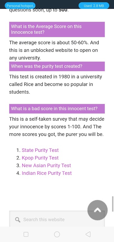 The Purity Test is one of the most taken quizzes and tests in the world. It is for the young students, people at college, and everyone who is willing to know how worldly they are. The test contains around one hundred questions regarding sex, drugs, crime, vice, and otherworldly things.