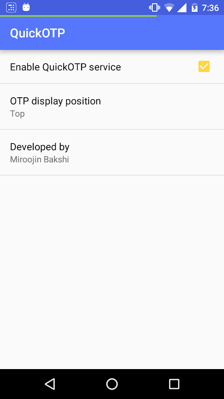 For users handling with money transactions online (online shopping, bank transfers, mobile recharge/top-up), it can become cumbersome to deal with One Time Password (OTP) based authentications. The user has to switch to the messaging app, open the appropriate SMS and memorize/copy the OTP every time. With QuickOTP, you can bypass this process. QuickOTP displays the OTP in a lucid and non-intrusive manner along with an option to quickly copy the OTP as soon as you receive your OTP message. The user does not have to switch apps during the transaction.