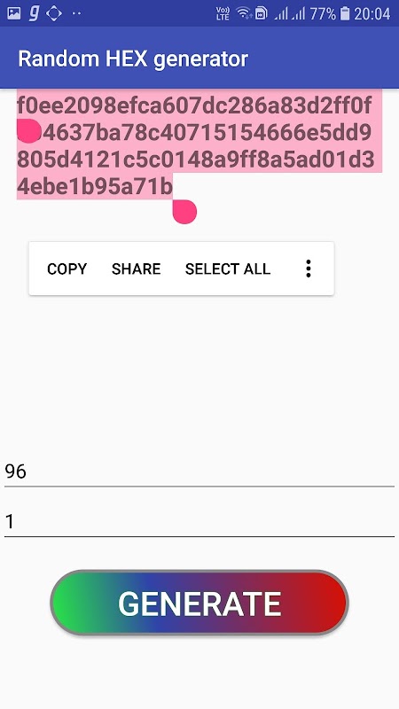 The App generates hex number of the a length requested by user and also generates multiple number of results .