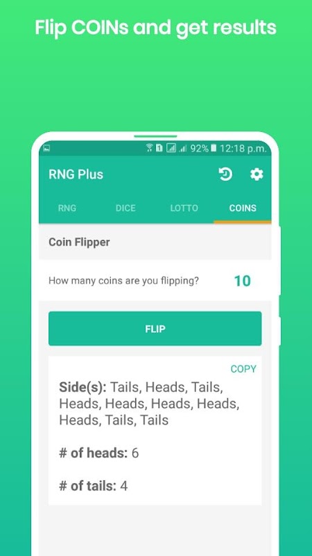Moet u snel een 50/50 weddenschap afwikkelen? Gebruik dan de Random Number Generator om een munt voor je om te draaien! Draai zoveel munten als je wilt wanneer je maar wilt. De app slaat ook het aantal munten van uw voorkeur op dat u kunt omdraaien voor snel hergebruik en geeft ook een overzicht van het aantal omgedraaide koppen en het aantal omgedraaide staarten in het resultatenvak. En ja, je kunt deze resultaten ook naar het klembord kopiëren.