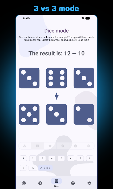 ⢠Spelletjesavond? Gooi tot 10 dobbelstenen tegelijk, met verschillende soorten dobbelstenen.