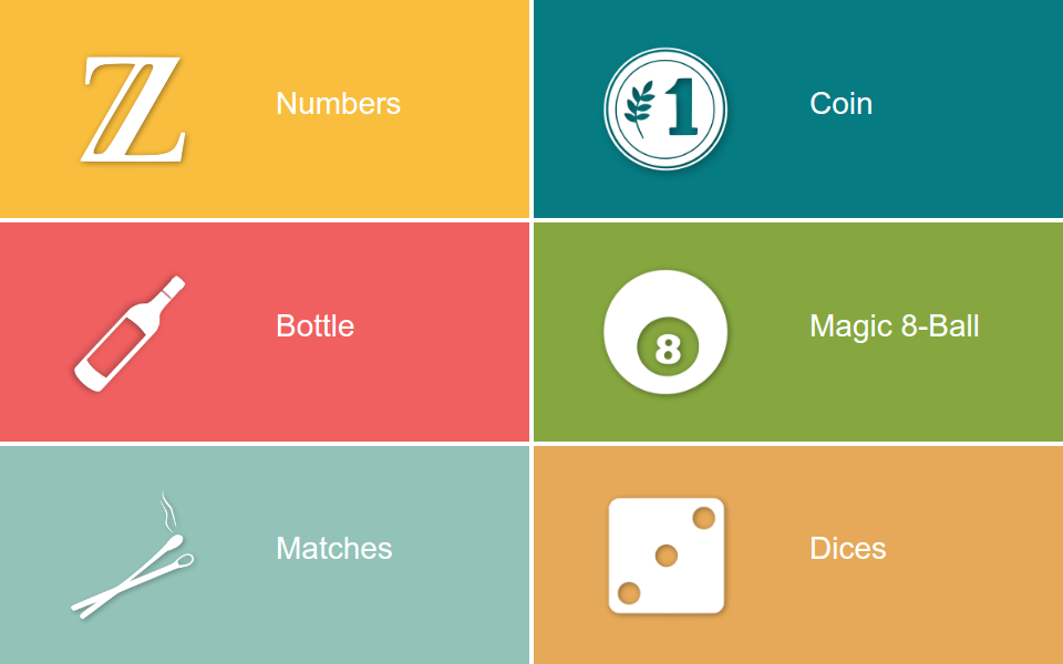 Krijg een willekeurig getal, gooi dobbelstenen, gooi een munt, draai een fles, trek de verbrande lucifer omhoog of stel zelfs een ja / nee-vraag.