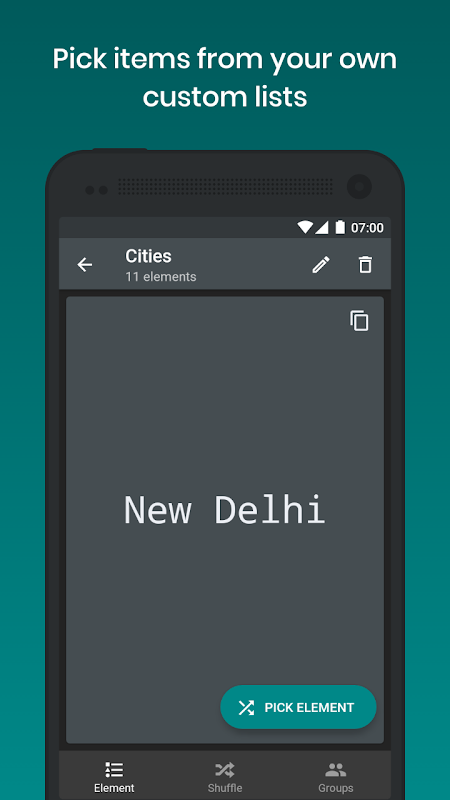 — Maak uw eigen aangepaste lijsten om er elementen uit te kiezen, ze in groepen op te splitsen of ze door elkaar te halen. Lijsten worden op uw apparaat opgeslagen. U kunt een back-upbestand van uw lijsten exporteren en het later weer in de app importeren (bijvoorbeeld als u een nieuw apparaat aanschaft).