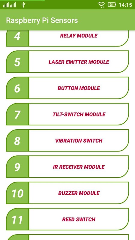 The app contains the description, circuit diagram and code to different sensors which be interfaced to Raspberry pi