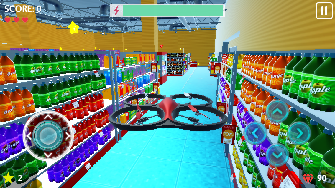 Vliegen op afstand bedienbare drones en het verzamelen van sterren op drie verschillende plaatsen: Office, Supermarkt en Warehouse.