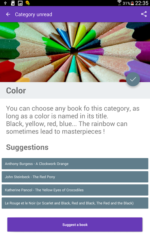 Voel je vrij om uw suggesties indienen van boeken passend in het thema en deel uw progressie met je vrienden.