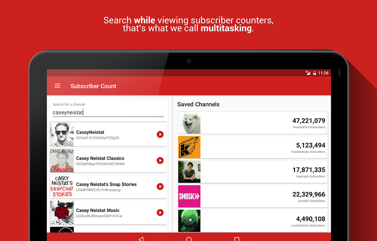 Realtime Subscriber Count bevat zoveel functies dat het niet alleen een reguliere abonneeteller is. Hiermee kunt u uw favoriete kanalen opslaan, zodat u altijd snel een blik kunt werpen op het aantal abonnees door gewoon de app te openen! U hoeft niet eens ergens op te klikken, open gewoon de app en u bent klaar.