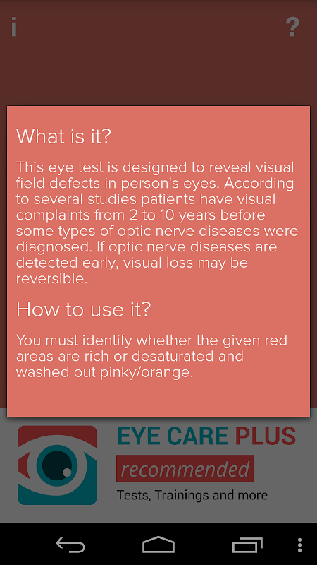 Deze applicatie is niet bedoeld als opticien regelmatig volledig onderzoek vervangen. Wij adviseren u een volledige oogtest na het gebruik ervan.