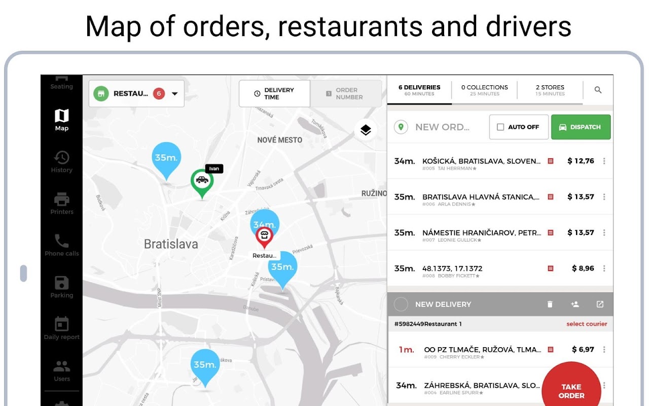 • Kaart met bestellingen + restaurants + chauffeurs + kaartlagen