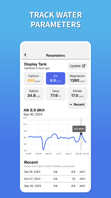 - Parametertracking: controleer moeiteloos de waterparameters van uw riftank. Visualiseer uw gegevens in intuïtieve grafieken om een bloeiend zoutwaterecosysteem in stand te houden.