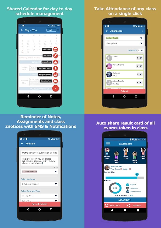 A Pool between Student, Parent, Teacher & Admin :Online tests, spot results, Calendar, Live notice board, discussion and many more..