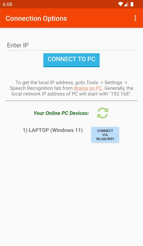 1) Zorg ervoor dat uw PC en Android-toestel zijn aangesloten op hetzelfde WiFi-netwerk. Als u niet beschikt over een WiFi-router hebt, kunt u ook gebruik maken van WiFi Hotspot mogelijkheid om verbinding te maken. Ook voor zorgen dat Braina actief is op uw PC. U kunt downloaden Braina voor de PC vanaf hier: http://www.brainasoft.com/braina/download.html