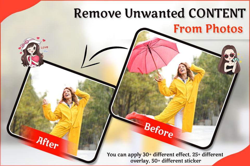 Remove Object: Erase Unwanted Content from Photo lets you erase unwanted content in a photo where its people you don't want in the photo or objects that you want to remove the photos.