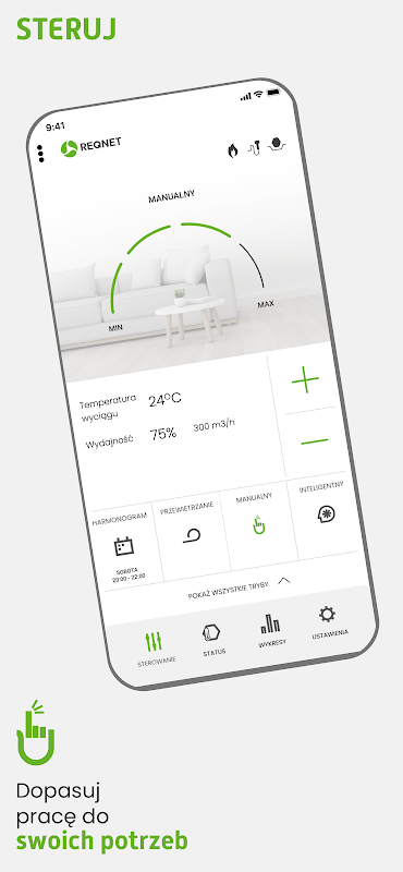 Pas de bedrijfsmodi aan uw behoeften aan, stel ventilatieschema's in, ontvang meldingen over de status van het apparaat en regel de luchtparameters met behulp van duidelijke grafieken.