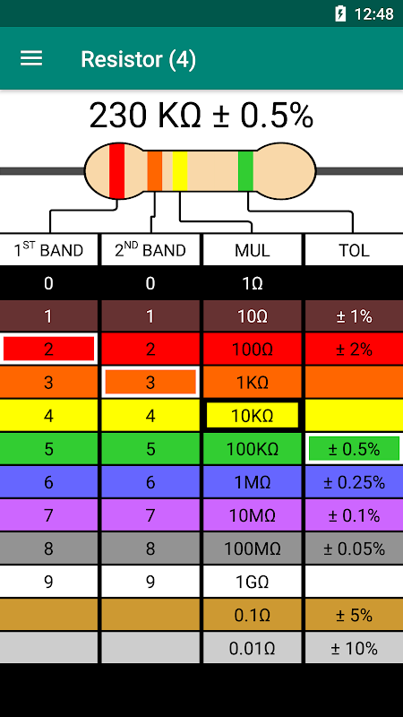 De applicatie is een eenvoudig te gebruiken kleurcodecalculator voor het berekenen van de weerstandswaarde van een weerstand. De applicatie ondersteunt kleurcodes voor 4-, 5- en 6-bandweerstanden.