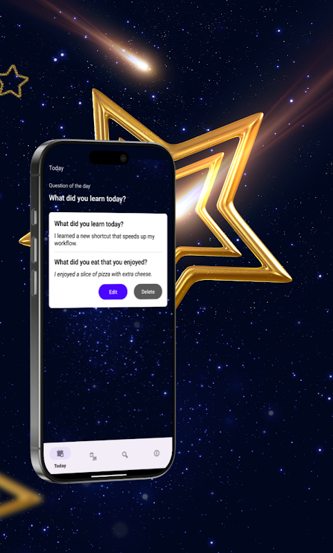 Functies die je elke dag zult gebruiken: Twee velden per dag - snel en gemakkelijk in te vullen. Kalenderweergave - tik op een datum om je notitie te lezen of te bewerken. Zoeken - vind herinneringen op basis van woorden en zinnen. Statistieken - totaal aantal notities, maandelijkse activiteit, huidige reeks en beste reeks.