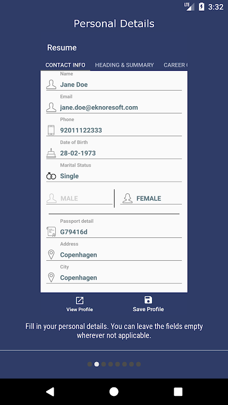 Nu kunt u met deze app direct een eenvoudig en professioneel cv maken voor uw sollicitatiegesprek. U kunt alle details opslaan voor verder gebruik, zodat u niet telkens de details hoeft in te voeren. U kunt ook meerdere cv's maken als u verschillende soorten CV's of CV's voor verschillende personen wilt maken. Start dus met het maken van Cv voor sollicitatie en succes.