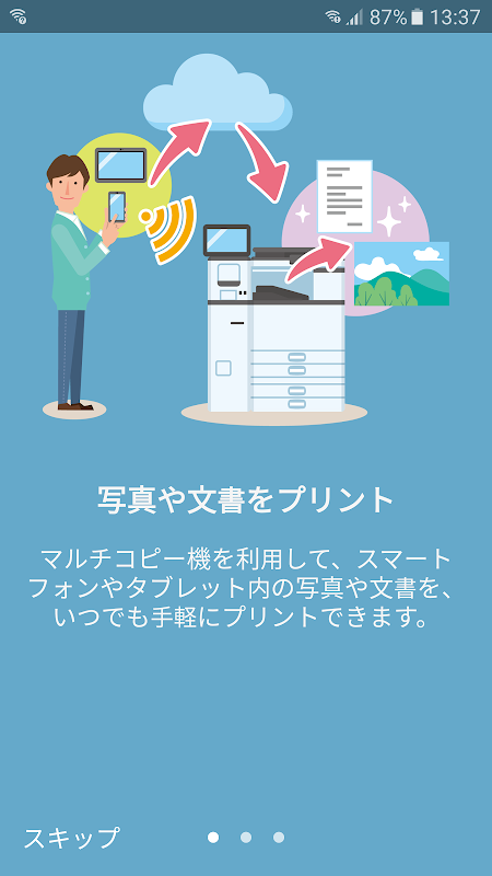 Met deze app kunt u foto's en documenten die op uw smartphone zijn opgeslagen, afdrukken vanaf Ricoh-kopieerapparaten (hierna "apparaten" genoemd) die in supermarkten en supermarkten zijn geïnstalleerd, en gegevens die met het apparaat zijn gescand, opslaan op uw smartphone.