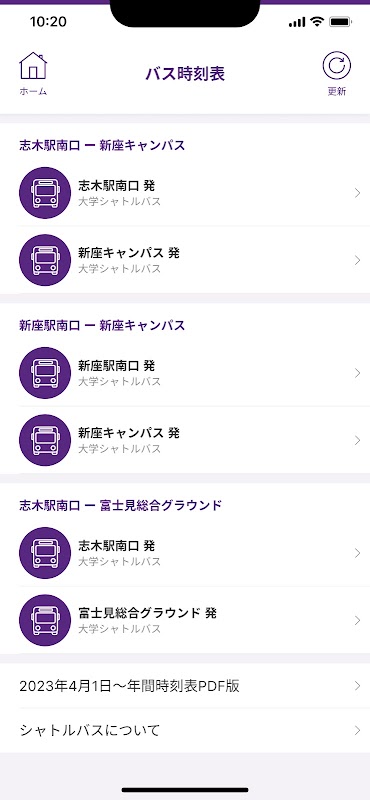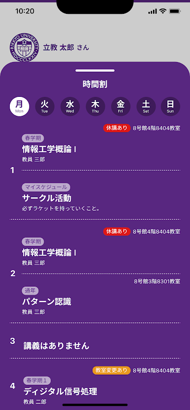 Naast lesinformatie zoals dienstregelingen en informatie over het annuleren van lessen, zullen we informatie verstrekken die nuttig is voor het universitaire leven, zoals aankondigingen van de universiteit en dienstregelingen van bussen. Je kunt ook automatisch meldingen van de universiteit krijgen via pushmeldingen.
