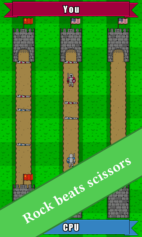 Choose your side (America or China) and then arm your soldiers with rock, paper or scissors. The soldiers will march towards each other, clash and the winner of the battle will face the next soldier deployed from their opponent's castle.
