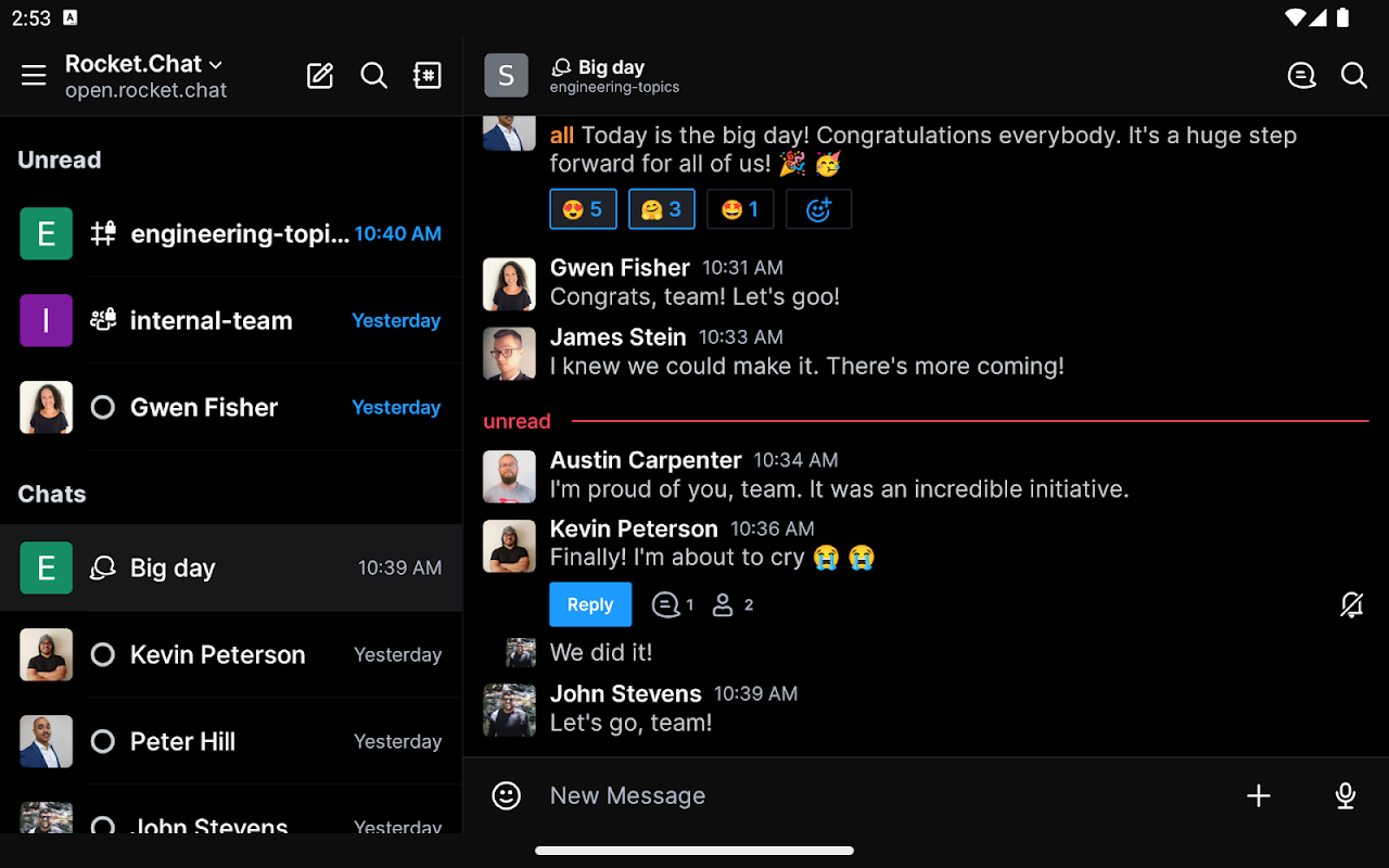 Rocket.Chat is een aanpasbaar open source communicatieplatform voor organisaties met hoge normen voor gegevensbescherming. Het maakt realtime gesprekken mogelijk tussen collega's, met andere bedrijven of met uw klanten, op verschillende apparaten op internet, desktop of mobiel.