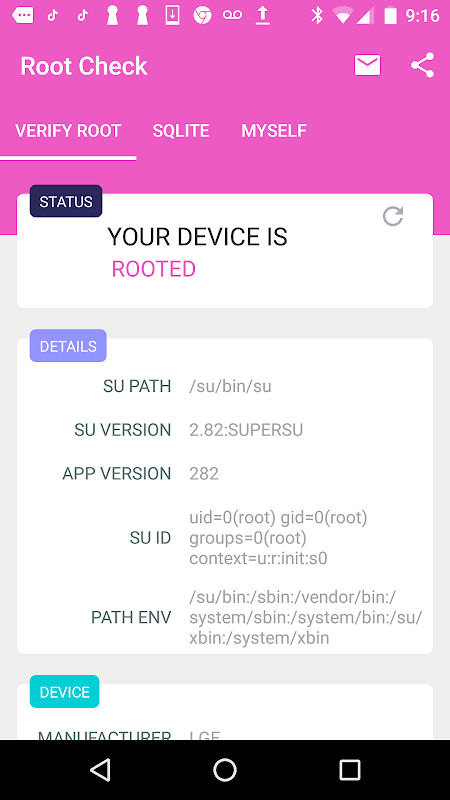 Hiermee wordt gecontroleerd of uw apparaat is geroot of niet. Als het apparaat wordt geroot, worden de rootgegevens weergegeven. Ook wordt gecontroleerd of SQLITE MASTER PRO is geïnstalleerd of niet. Als ze bestaan, geeft het versie, toegangsrechten etc. weer