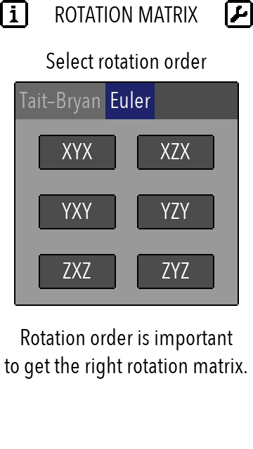 U typt de hoek en krijgt met een klik de resultaatmatrix voor de volgorde van de XYZ, XZY, YXZ, YZX, ZXY, ZYX, XYX, XZX, YXY, YZY, ZXZ, ZYZ asvolgorde.