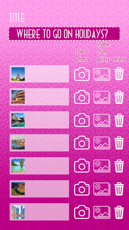 🍀 Beproef uw geluk en los uw dilemma's op! Roulette voor het Nemen van Beslissingen is een gloednieuwe app die je helpt bij het nemen van dagelijkse beslissingen. Als je niet weet wat je moet eten voor de lunch, wat te dragen of waar te reizen - dit keuzewiel zal je zeker helpen! Maak gemakkelijk een beslissing! U kunt een aangepast draaiwieltje maken door het naar wens te ontwerpen! Voeg je opties toe aan slots van het gelukkige wiel en draai aan het wiel! Binnenkort krijg je je resultaten door willekeurige selectie en als je de resultaten niet leuk vindt, kun je het altijd opnieuw proberen! Dus veel plezier en geniet van dit geweldige spinnerspel!