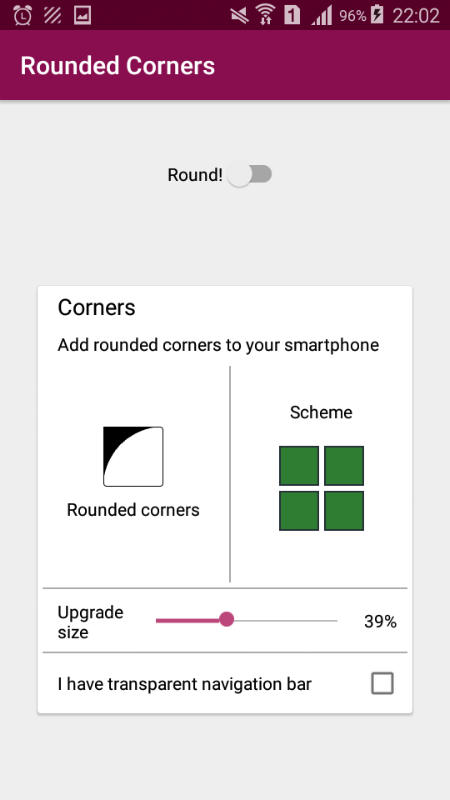 Dit is een Pro-versie van de app Rounded: Corners Curve. Met deze app kun je sexy afgeronde hoeken toevoegen op je apparaat. Pro-versie heeft geen advertenties en pretendeert extra inhoud te krijgen.