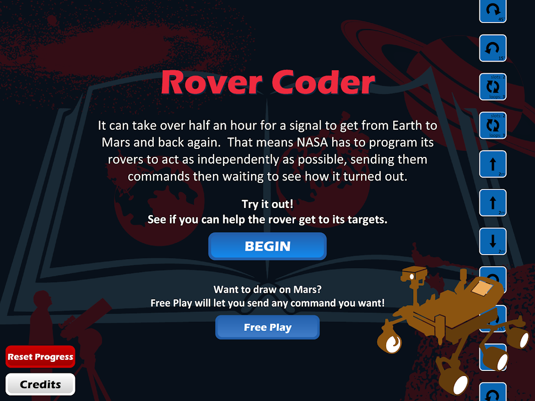 It takes so long to get signals back and forth to Mars that you can’t just drive a rover, you have to program how you want it to move. See if you can get this rover to various targets. Each level will get a little harder, but we’ll give you more programming commands to help. And if you’d rather just draw in the sand, try the Free Play mode.