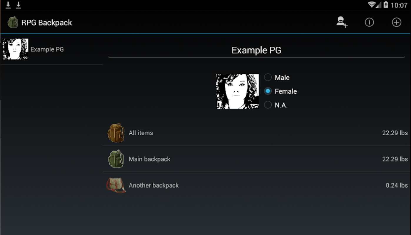 RPG Backpack is een applicatie die de personageapparatuur beheert voor een klassiek Rollenspel (pen & papier-RPG).