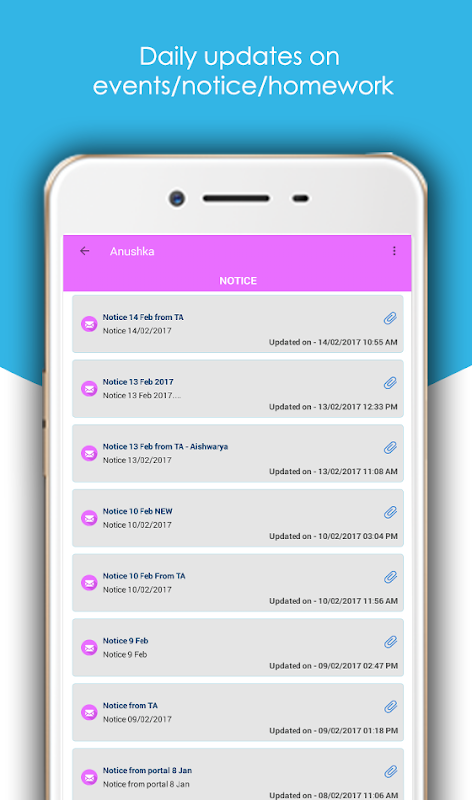 De functionaliteit omvat verschillende soorten communicatie en stelt de scholen in staat om op een slimme manier ouders op de hoogte te houden van de examenroosters, voortgangsrapporten, aanwezigheid, huiswerk, vergoedingen, mededelingen, evenementen, tijdschema, enz. Op een realtime basis van hun wijk.