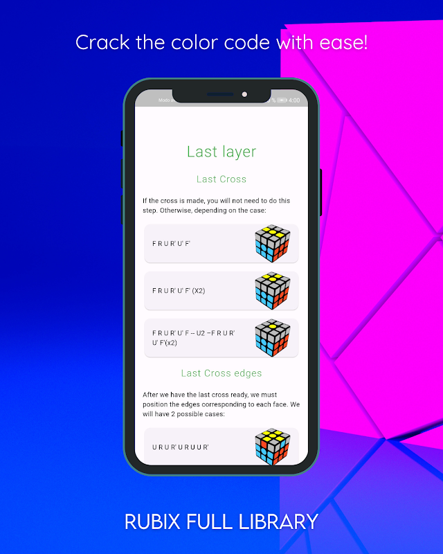 Met RubiX Cube Solver 3x3 Library leer je de meest populaire methoden met 3x3-algoritmen om de Rubiks-kubus op te lossen door middel van nauwkeurige beschrijvingen die je stap voor stap zullen begeleiden en je de Rubiks-kubus-algoritmen 3x3 zullen geven in de belangrijkste methoden voor het oplossen van Rubiks-kubussen, zoals Fridrich CFOP en Zz-methode algoritmen