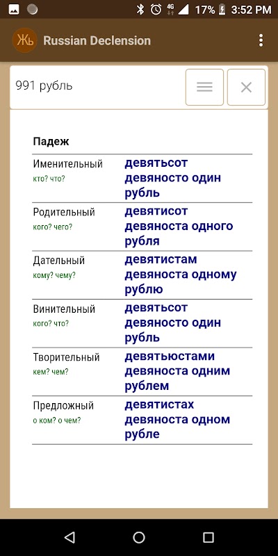 The application carries out declension according to grammatical cases of Russian words: nouns, numerals, including fractional, adjectives, pronouns, participles; converts numbers to strings for subsequent declension. The program produces grammatical declension using algorithms (without using reference books, databases and Internet sources); not intended for educational use.