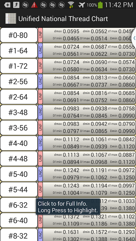 Geeft gedetailleerde informatie over de onderwerpen die voor inch / SAE draad maten volgens de ASME B1.1 standaard voor Unified National Inch Screw Threads. De gegevens in de applicatie worden berekend op basis van de formules in de ASME B1.1 standaard, en als gevolg daarvan af kan worden door .0001 "als gevolg van afronding gebruikt in de standaard. Dus iedereen die meer nauwkeurige gegevens moet de standaard direct te raadplegen. Enkele andere nummers zijn afgerond op minder dan 1/10000 ", maar deze app geeft ze nog 1/10000." Vasthouden aan de cijfers in deze app zal nog binnen de norm al. Het toont ook veel meer detail dan is vermeld in de tabellen in de standaard, zie screenshots om te zien welke informatie wordt weergegeven.