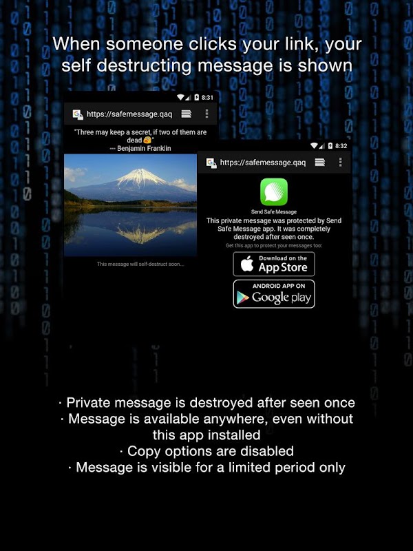 Deze app is een nieuwe tool om privéberichten met tekst en afbeeldingen te verzenden via je favoriete messenger. Berichten worden automatisch gewist, vernietigd, verwijderd direct nadat ze zijn gezien, waardoor het veel moeilijker wordt om de inhoud te delen, op te slaan of te kopiëren. Bovendien worden privéberichten uit hun verband getoond aan de ontvanger, om de privacy te verbeteren. Alles is versleuteld om nog meer veiligheid toe te voegen.