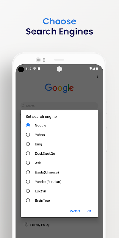 Saga Incognito Browser ondersteunt meerdere zoekmachines, waaronder Google, Bing, Yandex en Yahoo. Google is de standaard, maar u kunt dit wijzigen in de instellingen.